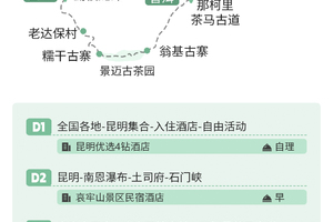 备注:上述报价为平时价格,节假日价格有上浮,请咨询客服,报价包含昆明接站一趟,昆明行程结束当天送站一趟,全程师傅带队,不含单房差,全程单房差900元。 |