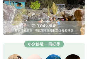 【温泉体验】石门关峡谷温泉穿插在行程中,看着璀璨的星空,在这里享受旅程的温暖和惬意,尽情放松自我;