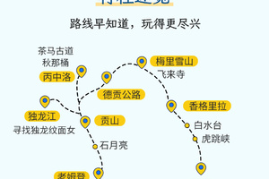 5)香格里拉:梅里雪山飞来寺、金沙江大拐弯、三江并流德贡公路、独克宗古城、纳帕海观景台、虎跳峡、白水台;