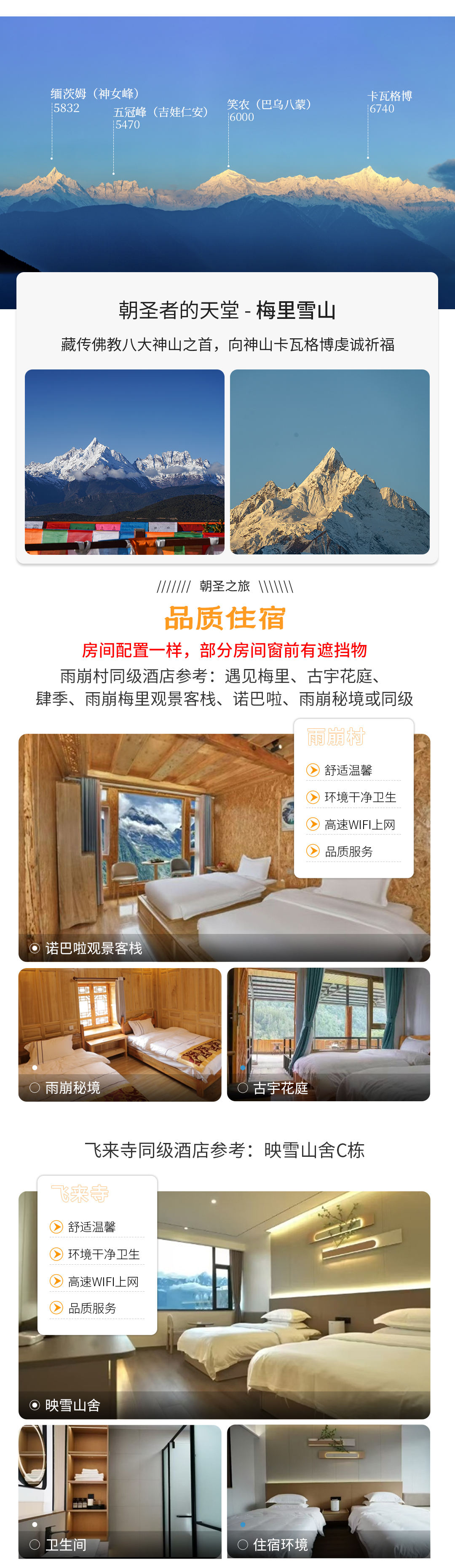 2、住宿:4晚按行程所列标准入住。(其中:①飞来寺酒店标间一晚,②雨崩村客栈标间3晚。);