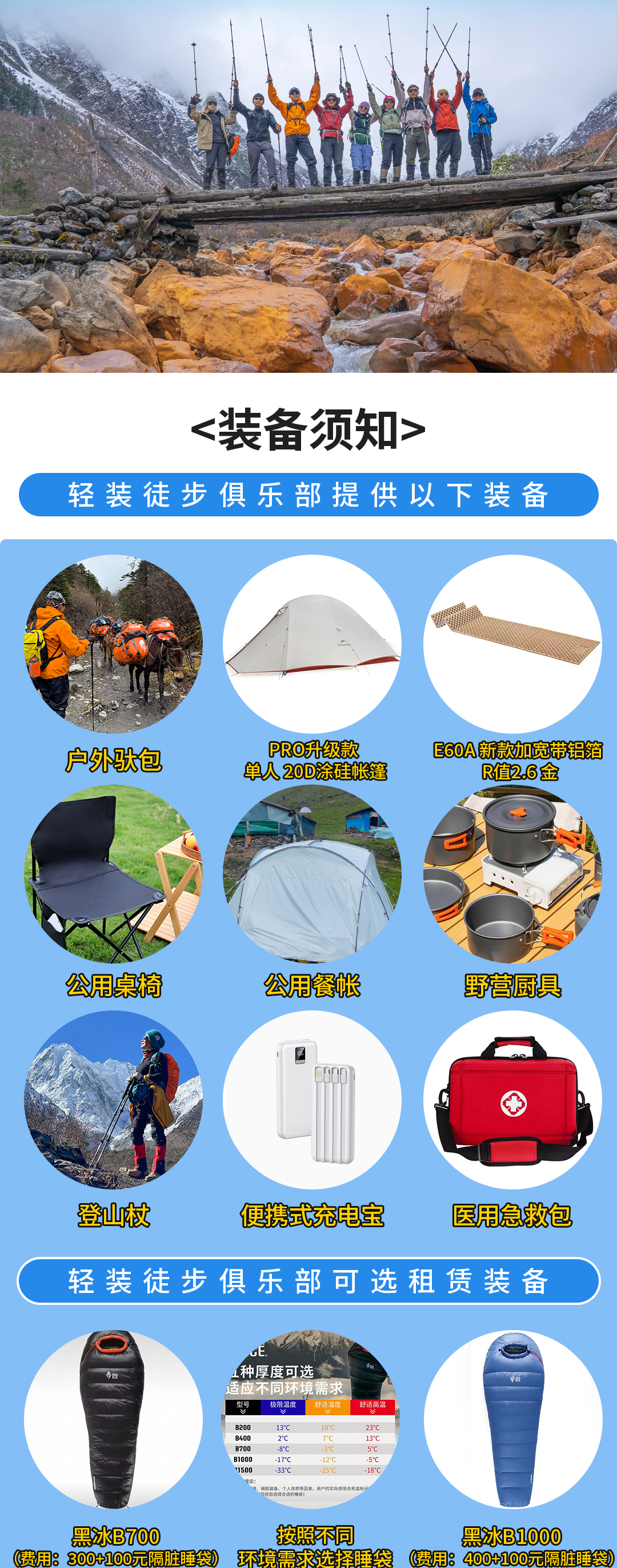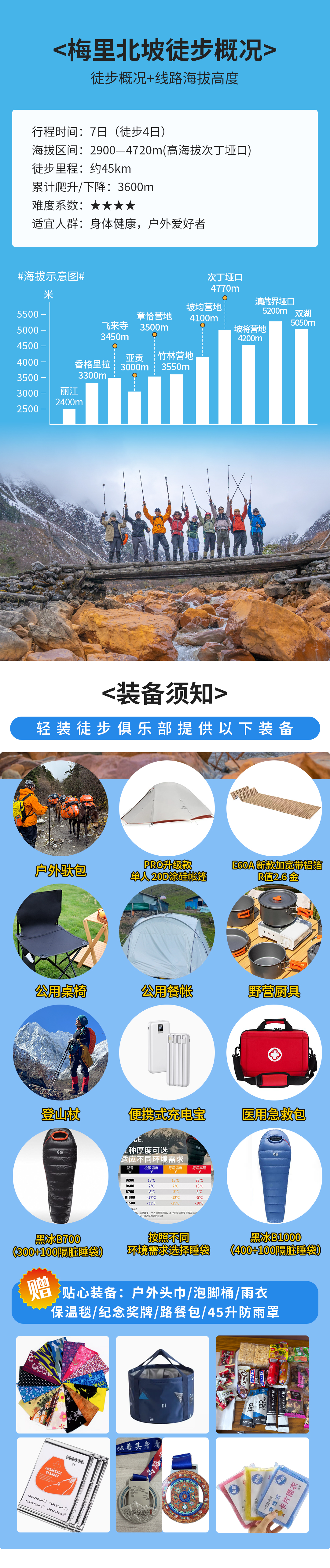 5、体力要求:本次行程全程轻装,每天徒步5~8小时,身体健康,有一定户外经验,无重大疾病史者均可参加。