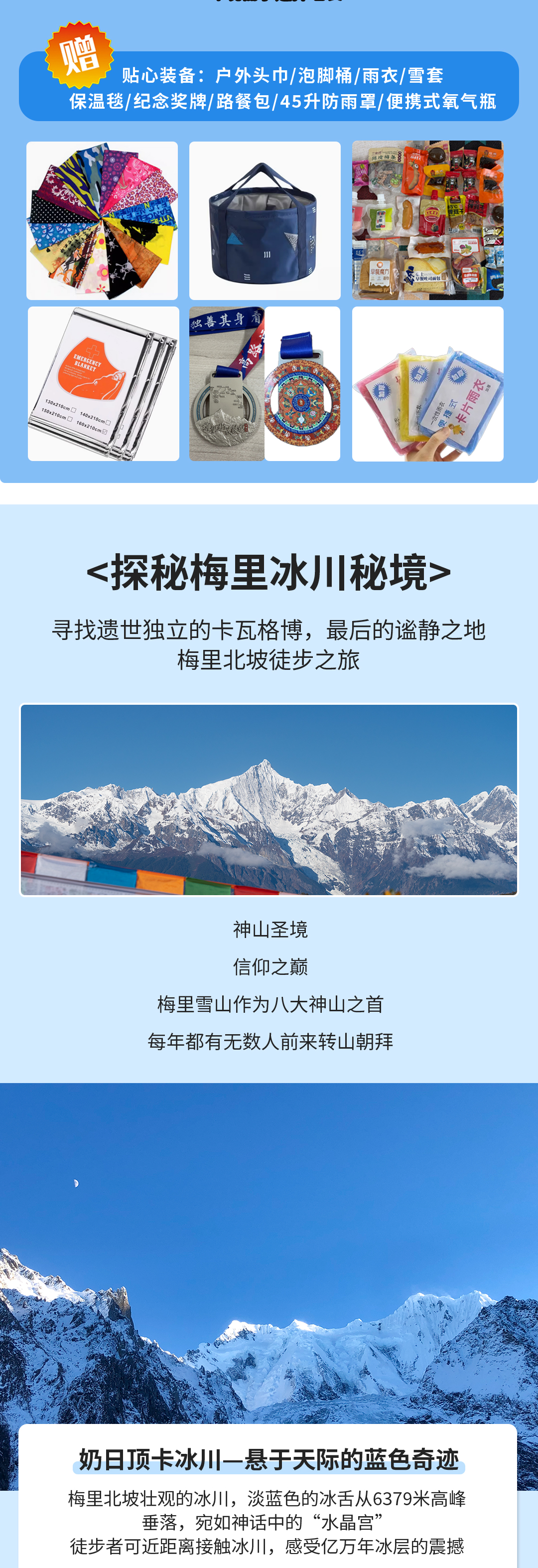 3、赠送装备:雨衣、泡脚桶、户外头巾、急救毯、防雨罩、登山纪念奖牌