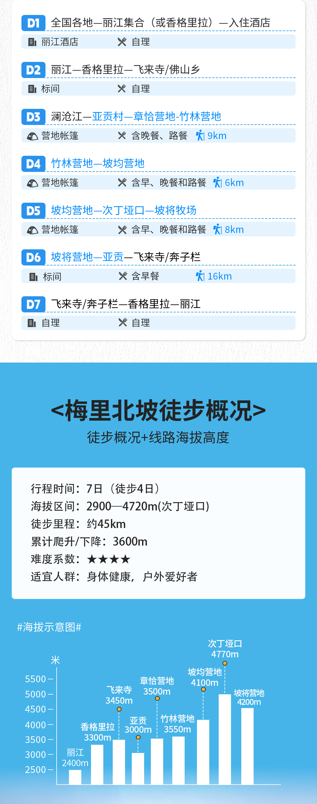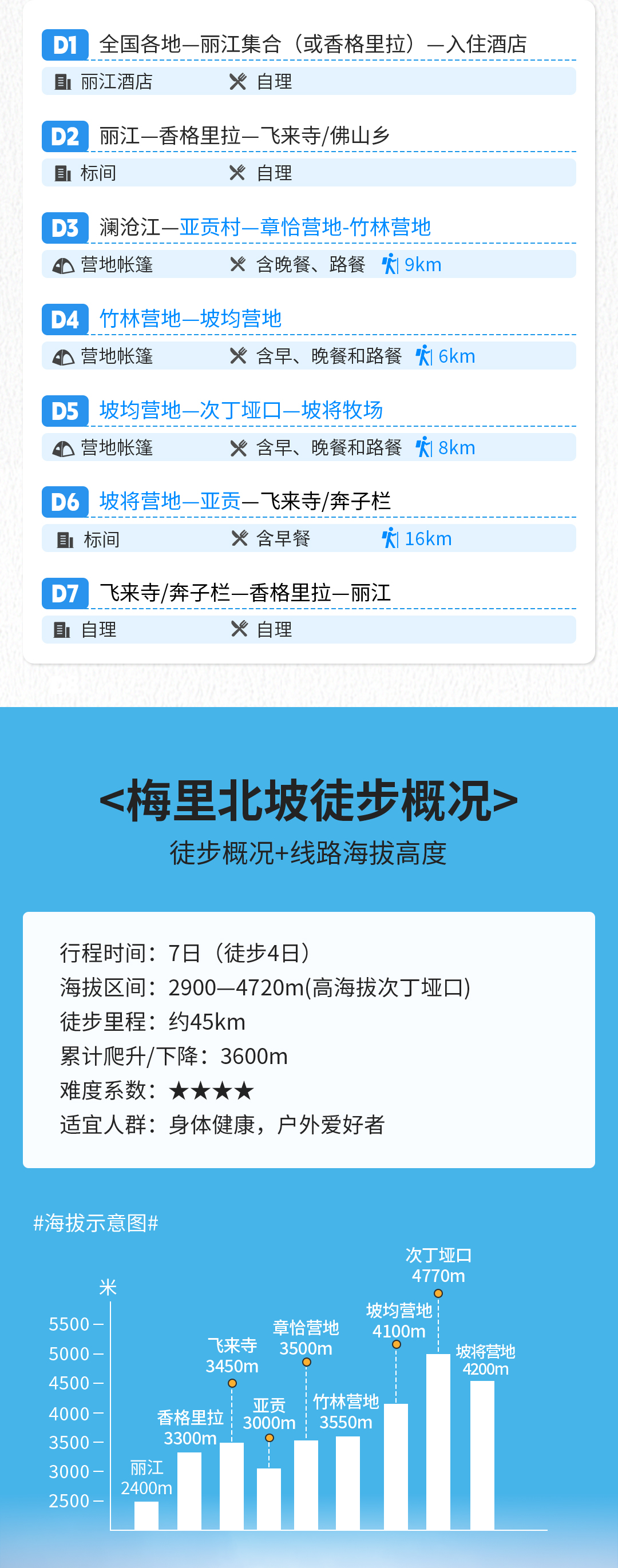 本次活动全程7天,其中徒步4天,行走约40km,累计爬升/下降3600米,最低海拔2900米,最高海拔4720米。