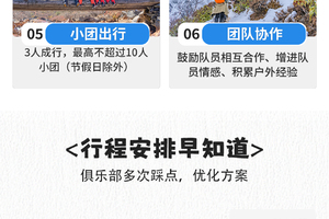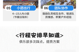 3、领队为队伍的核心,报名参加者同意在本次活动中接受活动领队的安排,自行执意更改线路及脱离团队的,费用不退并且自行承担所造成的后果;强调团队精神,互帮互助,女士优先原则。