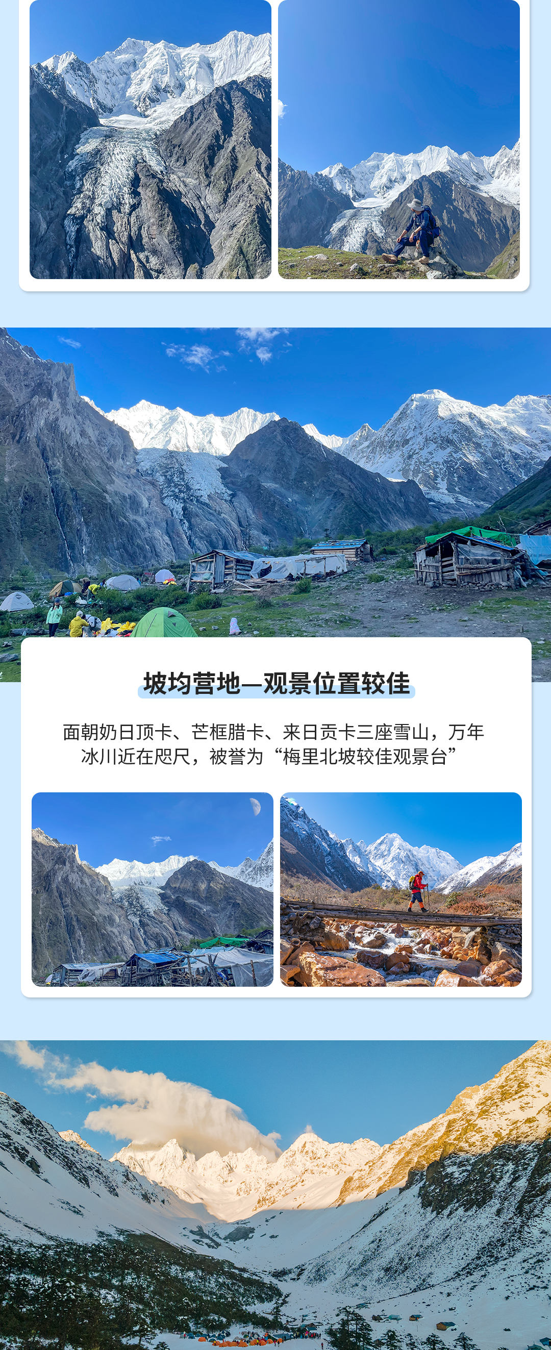 早上,吃过早饭出发。沿着小河向着雪山前行,之后海拔逐渐上升,远处的雪山露出全貌。穿越森林,跨过山石,芒框腊卡峰完全展现在眼前。经过一个废旧牛场,通过木桥,爬上山坡,奶日顶卡及其衍生冰川迎面而来。向着雪山继续前进,很快便可到达坡均营地。营地正面就是梅里雪山北坡,奶日顶卡冰川、来日贡卡、奶日顶卡、芒框腊卡一览无余。雪山冰川、白云蓝天、河流草甸……悠然惬意,今天徒步路程较短,可以慢慢享受这山间的细风和阳,记录下美好的风景。