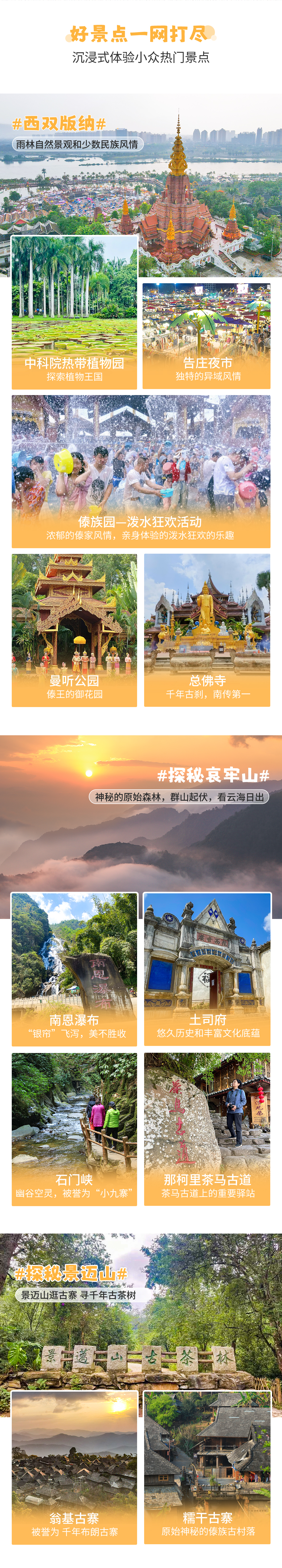 1)西双版纳:中科院植物园门票、傣族园门票、曼听公园门票、总佛寺、傣乡水城、景真八角亭