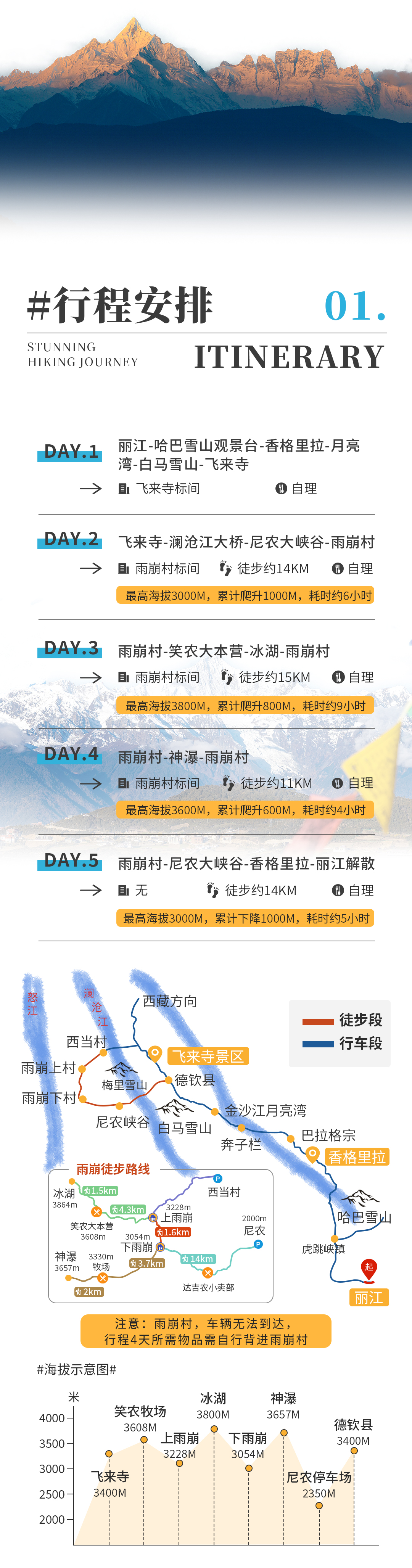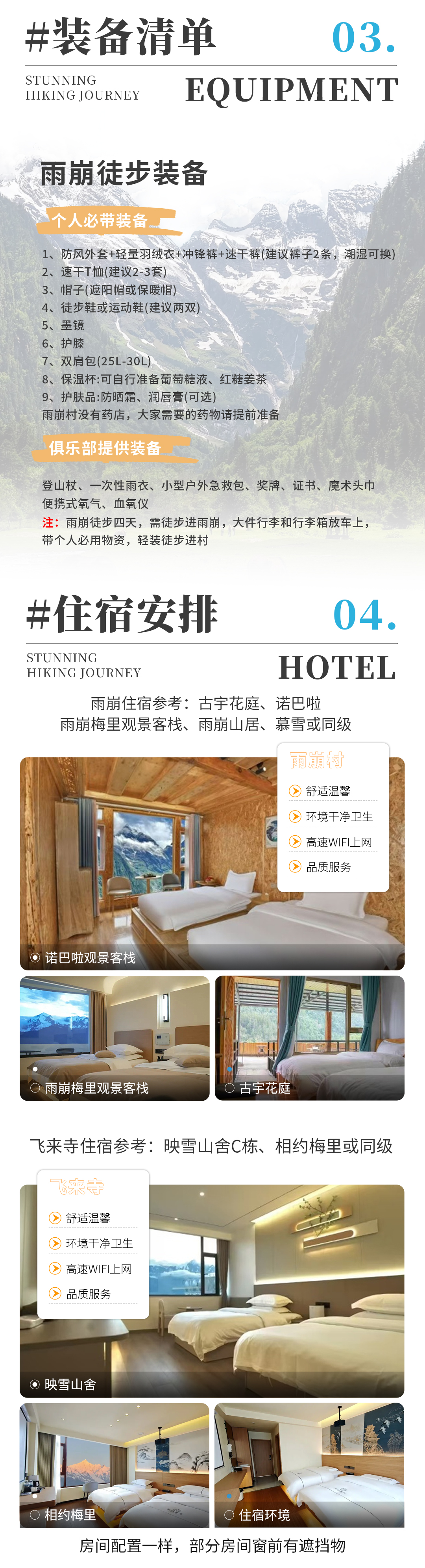 其他:进村只带必要装备,轻装前行,行李箱等可以放在车上,其他个人用品可放在入住的酒店