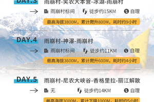 清晨用完早餐后,从住宿地出发,经高海拔原始森林及杜鹃丛林,徒步将近2小时后翻过海拔3900米的上那宗拉丫口,直至雨崩河河底,再穿过一片原始松树林后就到达海拔3800米的笑农大本营,享用美味的午餐,稍作休整,为接下来的旅程补充体力,之后向海拔4100米的冰湖进发;大约下午二点钟的时候开始返回,于黄昏六点钟左右返抵雨崩村。