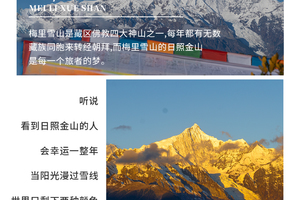 早晨6:00起来,拍摄难得一见的日照金山奇观,飞来寺观景酒店是拍摄梅里雪山最佳的位置,从这里你将领略藏区八大神山之首,世界最美的雪山之一,神圣的梅里十三峰。20分钟里金光映照的梅里雪山光芒万丈美不胜收(据藏民所说,日照金山是有缘人方可看到,看到后会幸运一整年)。