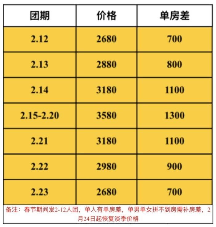 3、单房差:单人报名我们根据报名顺序安排同性拼房,若要求单住或拼不了房,需补单房差;临时要求单住需要补双倍单房差