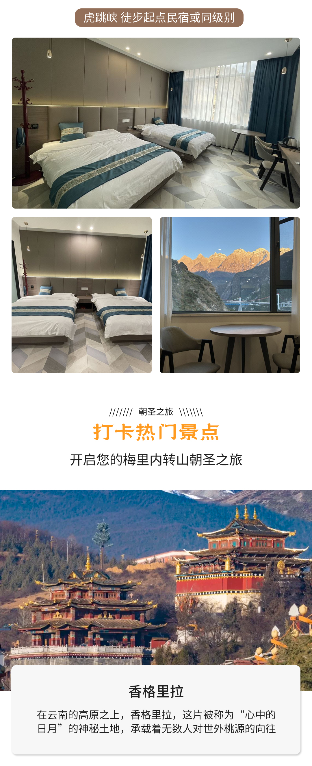2、住宿:按行程所列标准入住。(默认拼房,其中:①虎跳峡镇一晚,②飞来寺一晚,③雨崩村客栈3晚)