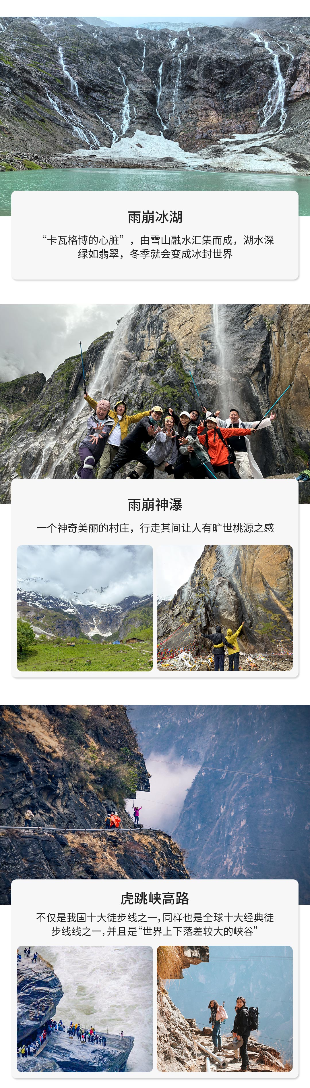 装备:奖牌2件/人(虎跳峡、雨崩各1)、便携式雨衣1件(雨季提供)、提供登山杖1支/人使用、魔术头巾;