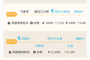 清晨,在飞来寺观景台欣赏美丽的日照金山奇景。之后,乘车一路前行,抵达尼农,开始徒步向雨崩村前进。今天全程大约14公里。用时6-8小时。沿着尼农大峡谷一路徒步,两边是悬崖峭壁,这是古人从悬崖上凿出来的一条通往雨萌秘境的阳光大道。徒步大约3.5小时到达补给点在这里稍作休息后沿着公路前往雨崩,沿途美景如画,令人目不暇接。到达雨崩村客栈后办理入住自由活动。